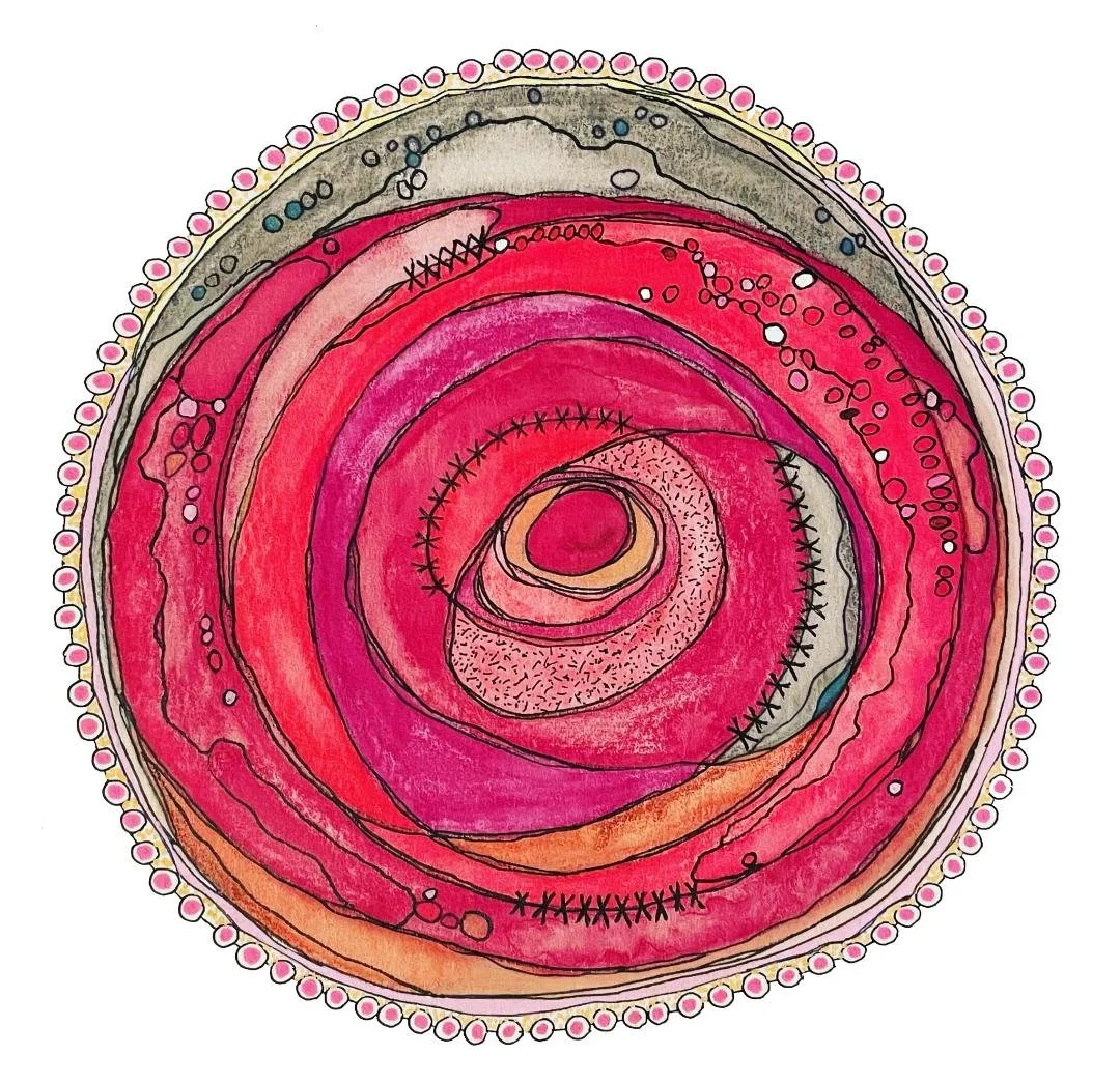 Watercolor pencils, colored pencils, acrylic paint pens, micron pens, and graphite on watercolor paper.