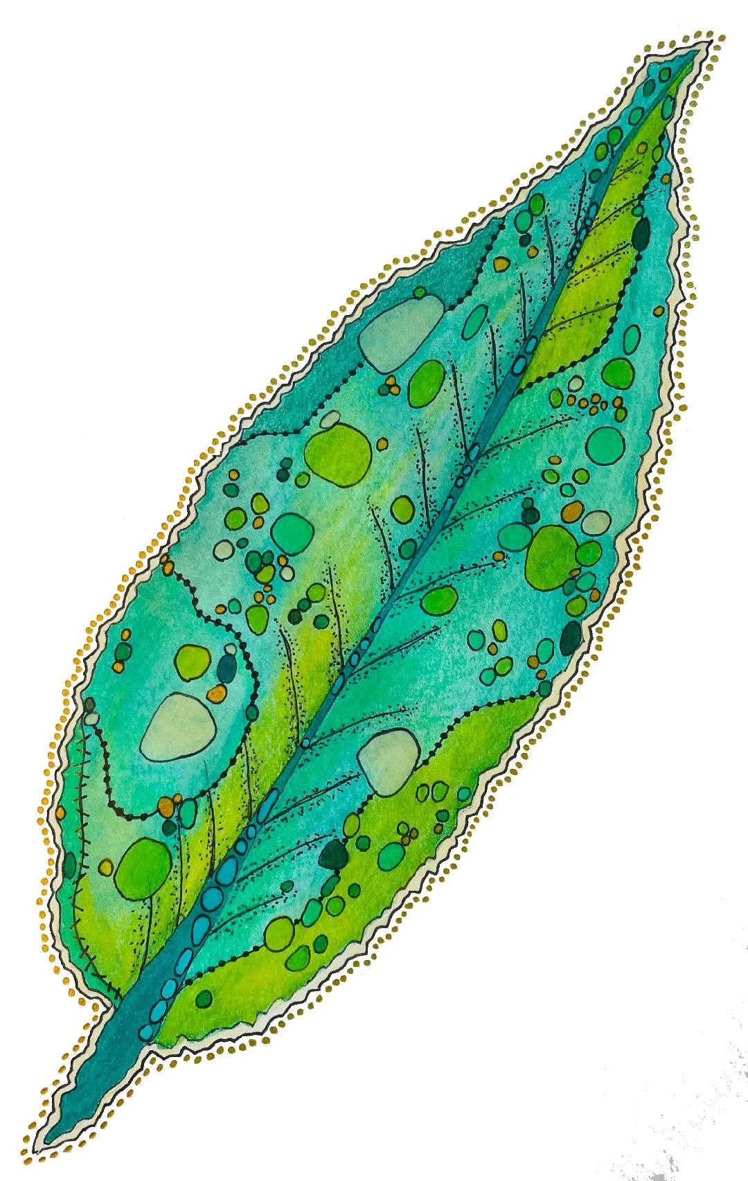 Watercolor pencils, colored pencils, acrylic paint pens, micron pens, metallic pens, and graphite on watercolor paper.